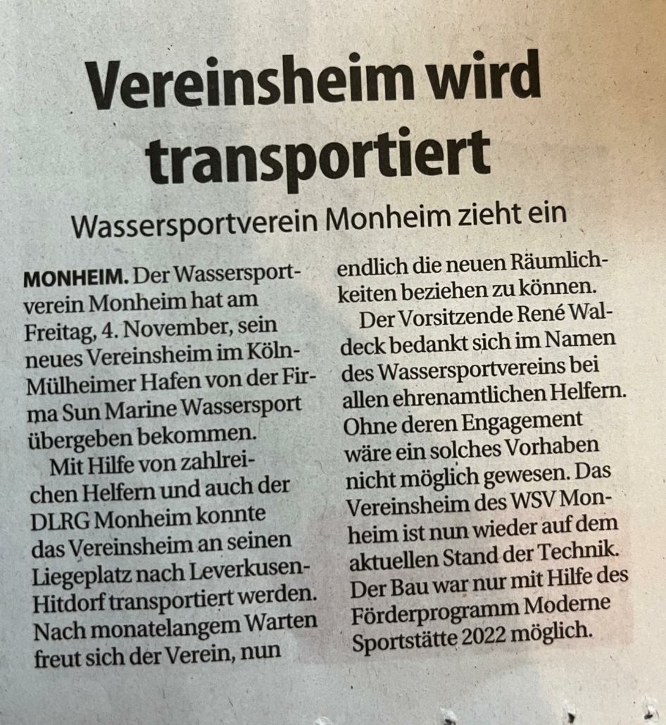 Wir freuen uns mitteilen zu können, dass der Wassersportverein Monheim sein neues Fahrschulboot übernommen und dieses anschließend mit Motor und Technik versehen hat. Das Boot wird ab der Saison 2023 als Fahrschulboot und als Boot für SUP Begleitfahrten dienen.